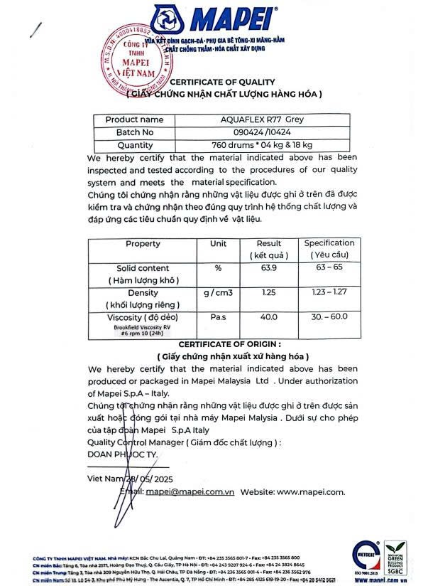 Sản phẩm chống thấm Mapei Aquaflex R77 có đầy đủ chứng từ, chứng chỉ chất lượng đạt chỉ tiêu thông số như công bố, đảm bảo an toàn và hiệu quả trong quá trình sử dụng.