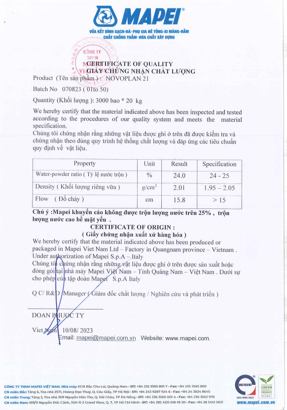 Sản phẩm vữa tự san phẳng Novoplan 21 có đầy đủ chứng từ, chứng chỉ chất lượng đạt chỉ tiêu thông số như công bố, đảm bảo an toàn và hiệu quả trong quá trình sử dụng.