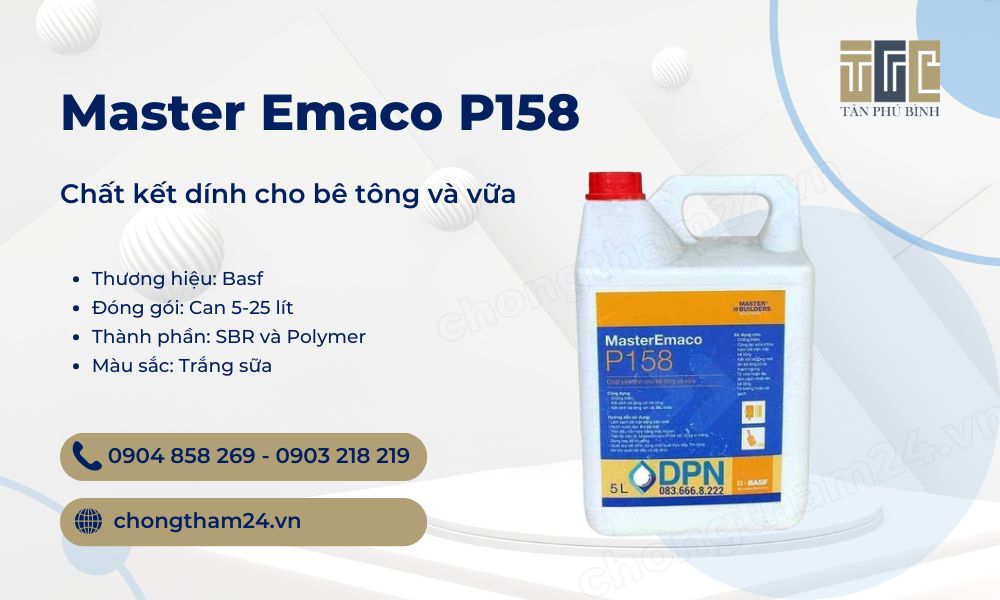 Master Emaco P158 là chất kết dính gốc SBR và Polymer gia cường cho vữa và bê tông. Đây là hợp chất là dạng Latex nhũ tương kết hợp giữa Stiren và Butadien. Sản phẩm giúp tăng khả năng kháng mài mòn, tăng độ bền, tăng khả năng chống thấm và kết dính.
