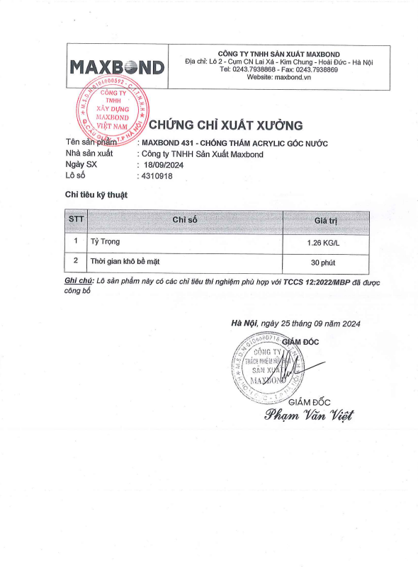Sản phẩm chống thấm Maxbond 431 có đầy đủ chứng từ, chứng chỉ chất lượng đạt chỉ tiêu thông số như công bố, đảm bảo an toàn và hiệu quả trong quá trình sử dụng.