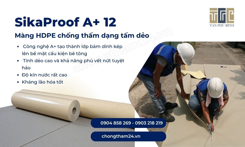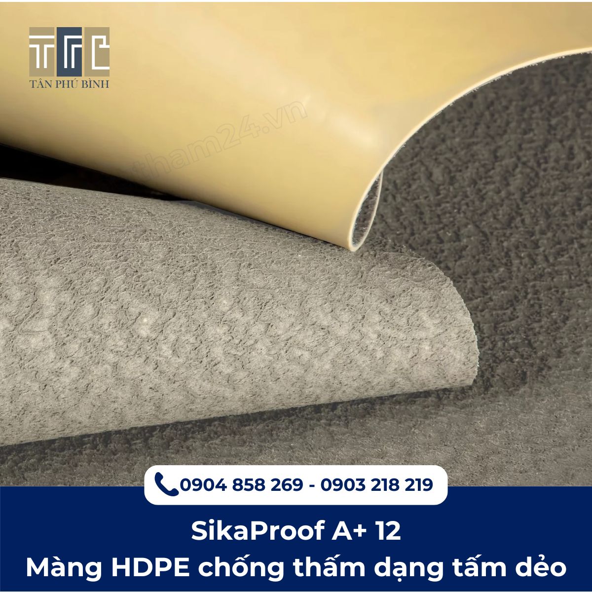 SikaProof A+ 12 là màng chống thấm dạng tấm dẻo. Với công nghệ bám dính toàn bộ, vĩnh viễn lên bề mặt các cấu kiện bê tông cốt thép. Cấu tạo gồm tấm nền gốc polyolefin (FPO) cùng với lớp bám dính lai độc đáo, hình thành lên hệ bám dính kép (bám dính cơ học và bám dính hóa học) lên bề mặt bê tông mới đổ.